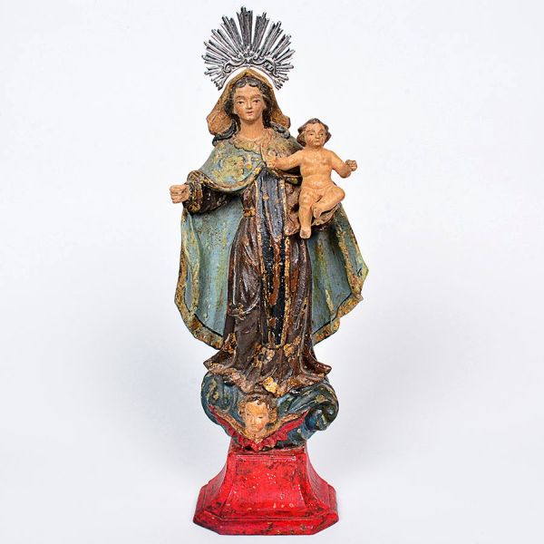 • Imagem de <b>Nossa Senhora do Carmo </b>em madeira entalhada em policromia. Veste em plissados espraiada aos pés. O Menino apoia-se sobre a mão esquerda. Sobremanto em azul claro. Realces a ouro. A santa pousa sobre enrolados de nuvens com cabeça de anjo à frente. Base trapezoidal em vermelho. Séc. XVIII. Alt. 33 cm