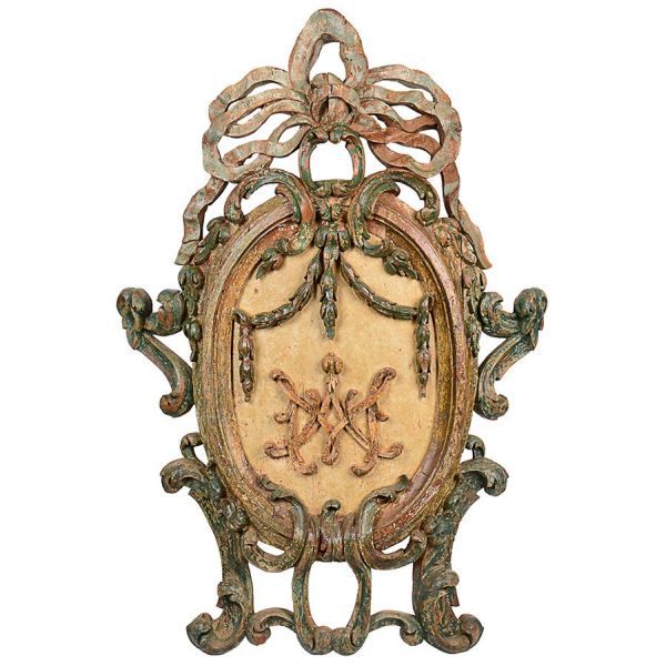 • Belíssima <b>talha </b>em forma de florão em madeira policromada, decorada com elaborados entalhes em laços vazados, guirlandas e volutas. Ao centro a letra "M" estilizada referendando Maria. Período de transição do Barroco para o Neoclássico. Séc. XVIII. Med. 130 x 89 cm