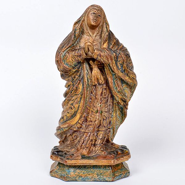 • Linda imagem representando <b>Nossa Senhora das Mercês </b>em madeira, apresentando talha erudita em plissados verticalizados. Belo tratamento dado ao cabelo preso em coque baixo. Ricos realces a ouro e policromia íntegra. Séc. XVIII. Alt. 31,5 cm