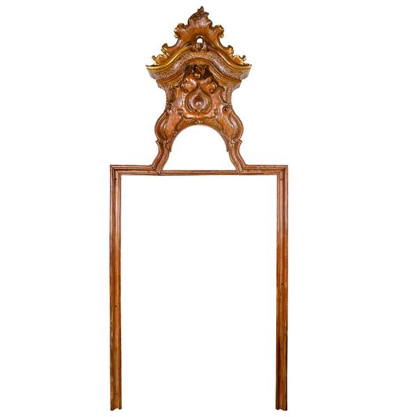 • <b>Talha </b>em madeira belamente patinada, apresentando forma retangular e estrutura retilínea com frisos boleados. Ao topo destaca-se um frontão entalhado com elementos vegetais em composição barroca. Realces a ouro. Séc. XVIII. Med. 400 x 175 cm