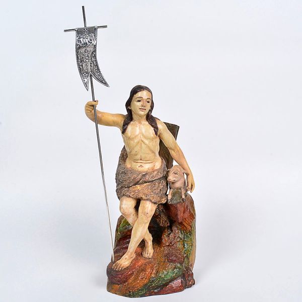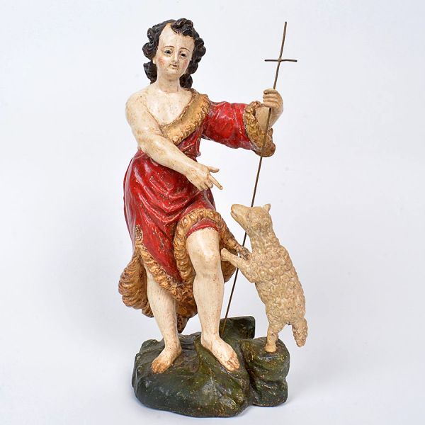 • Bela imagem de <b>São João Batista </b>em madeira entalhada e policromada. À mão esquerda o cajado com a flâmula em prata com as iniciais JHS - Jesus Salvador dos Homens. Olhos em contas. Início do séc. XIX ou fins do XVIII. Alt. 40 cm