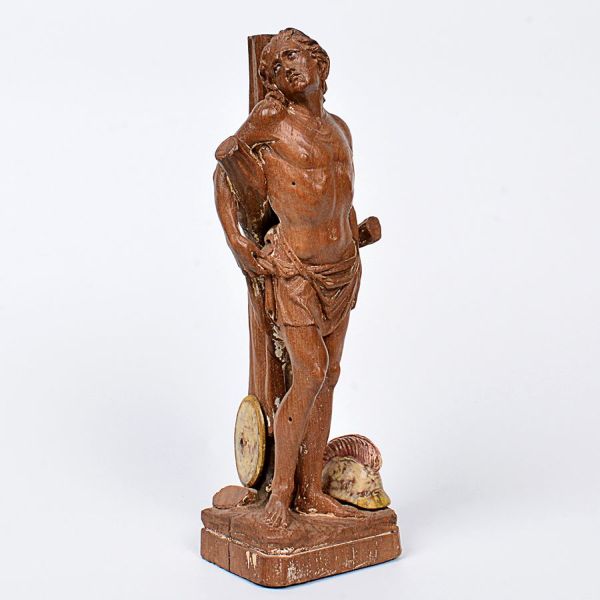 • Imagem de <b>São Sebastião </b>em madeira entalhada e policromada. Aos pés o capacete representando a entrega de sua vida a fé cristã. Muito boa erudição com características neoclássicas. Olhos em contas. Séc. XVIII. Alt. 24 cm