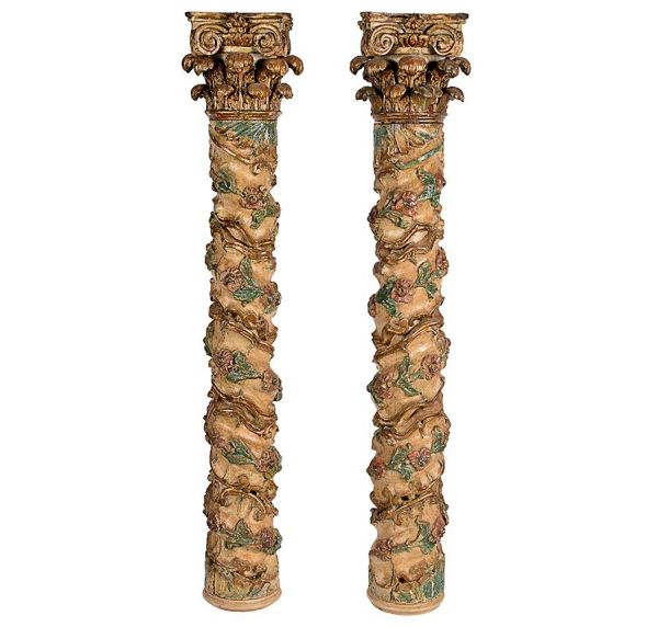 • <b>Par de belíssimas colunas </b>em madeira, entalhadas em "torsade" e decoradas com flores e folhas. Rico capitel com volutas reviradas para fora apoiando base em enrolados. Policromia original preservada. Alt. 140 cm