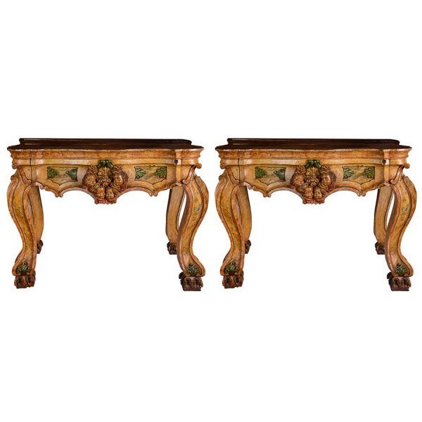 • Magnífico <b>par de credências </b>estilo e época D. João V em madeira. Tampo recortado e entalhes barrocos ressaltando arranjos com anjos em rica policromia. Robustas pernas recurvadas. Séc. XVIII. Med. 84 x 115 x 78 cm