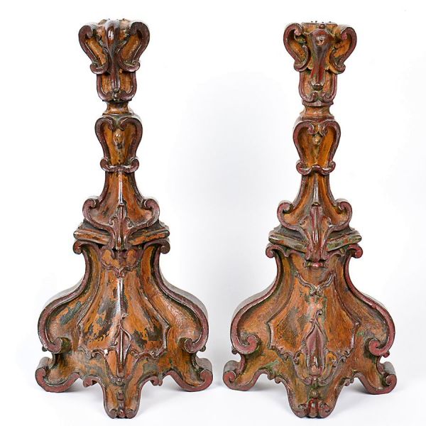 • Lindo <b>par de tocheiros </b>em madeira entalhada em elegante movimento predominando elementos da rocalha com angras, volutas e acantos. Pátina original. Séc. XVIII. Alt. 72,5 cm