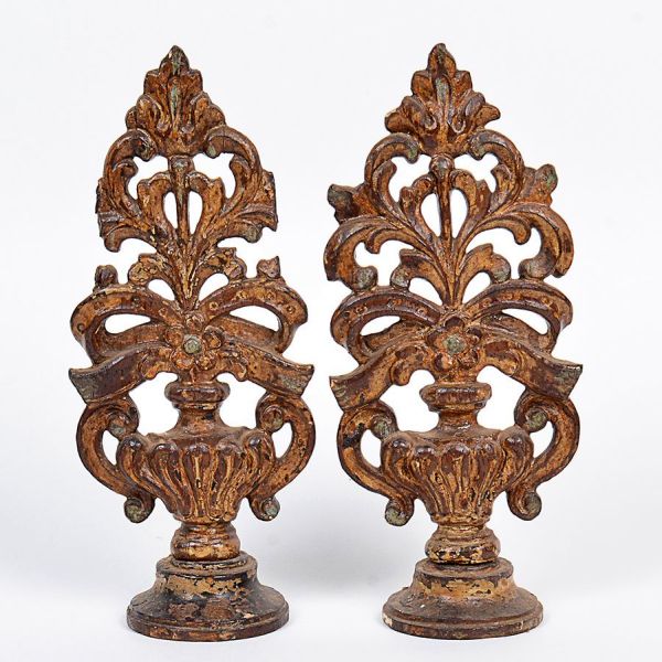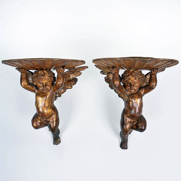 • Lindo <b>par de peanhas </b>barrocas representadas por figuras de anjos sustentando apoios em forma de "coquilles". Pátina dourada por toda a extensão do conjunto. Início do séc. XIX. Alt. 30 cm