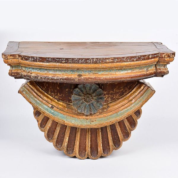 • Peanha em madeira entalhada e policromada com parte superior movimentada, roseta ao centro e base com gomos em baixo relevo. Realces a ouro. Séc. XIX. Med. 45 x 58 cm