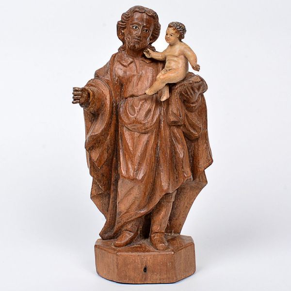 • Imagem de <b>São José de Botas </b>em madeira entalhada, tendo à mão esquerda, o Menino Deus evidenciado por policromia clara. Olhos em contas. Séc. XVIII / XIX. Alt. 24 cm