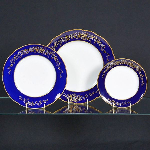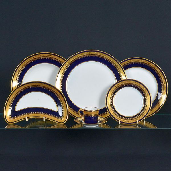 • <b>Serviço de jantar </b>em porcelana francesa Limoges, apresentando fundo branco com barrado em azul cobalto e friso a ouro decorado com arabescos. Marca da manufatura no verso. Constando de 23 pratos rasos, 12 pratos fundos, 12 pratos de sobremesa, 12 pratos p/ pão, 11 covilhetes meia lua e 8 xícaras p/ café com pires. Total de 78 peças.