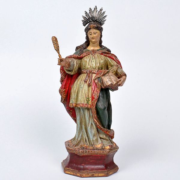 • Linda imagem de <B>Santa Quitéria </B>em madeira entalhada, com vestes em rica policromia. À mão esquerda traz uma palma, símbolo do martírio e à direita o evangelho. Fina douração de época. Séc. XVIII. Alt. 28 cm