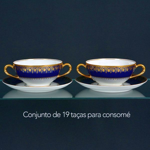 • <b>Conjunto de 19 taças para consomê com respectivos pires</b>, em porcelana Jean Haviland, produzidas para MAPPIN & WEBB - Rio de Janeiro. Corpo branco e faixa superior em azul cobalto, ornada por friso dourado em padrão de ogivas. Alças também realçadas em douração.