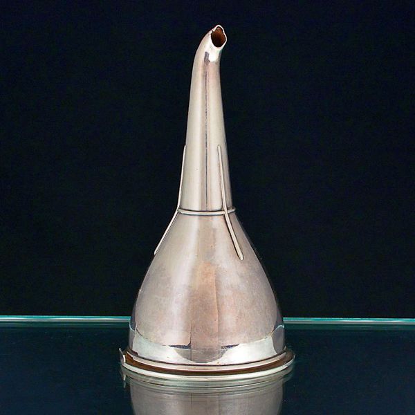 • "<b>Wine funnel</b>" em prata inglesa lisa, de formato cônico e bico recurvo. Parte interna com peneira. Contrastes da cidade de Sheffield do período georgeano e marca do prateiro Alexander Goodman & Co registrado em 1805. Compr. 15,5 cm