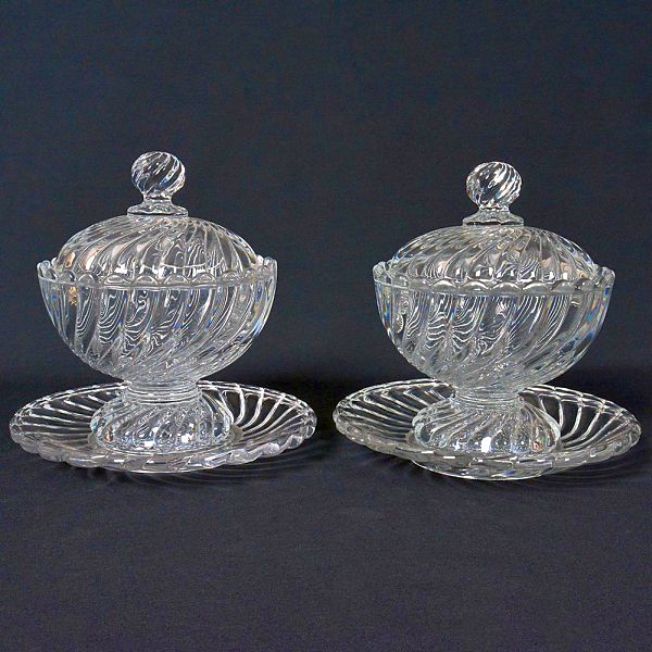 • <b>Par de compoteiras com seus pratos </b>em cristal francês "Baccarat", moldados com gomos torcidos. Bojos semiesféricos com bases cônicas. Tampas abobadadas e pires no estilo. Marcas da "Cristallerie" em todas as peças. Alt. 19 cm