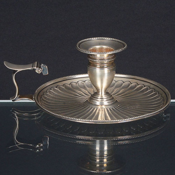 • <b>Palmatória </b>circular em prata inglesa georgeana, repuxada e cinzelada com gomos e borda perolada. Descanso de polegar recortado. Contrastes da cidade de Londres de 1805 e marca do prateiro R. C. Compr. 16 cm