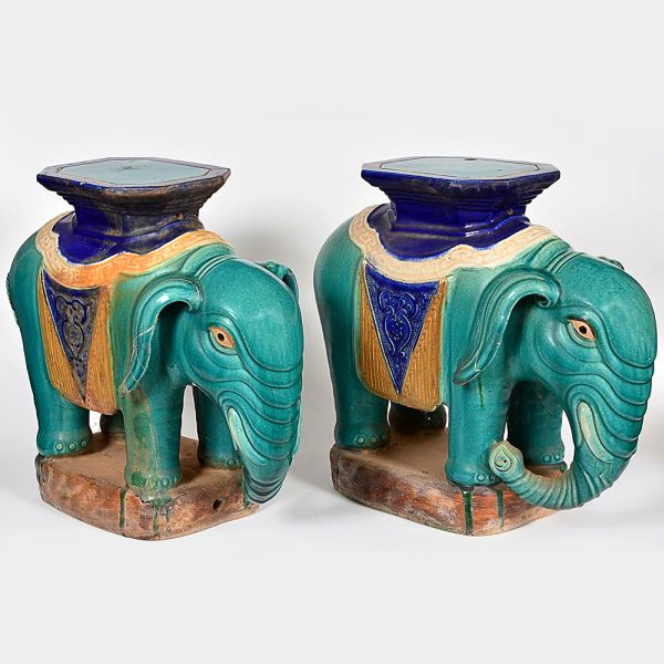 • <b>Par de banquetas </b>em cerâmica esmaltada, modeladas na forma de elefantes ricamente ornamentados com mantos coloridos em azul e dourado. Apresenta pequenas quebras nas orelhas. Med. 33 x 60 cm