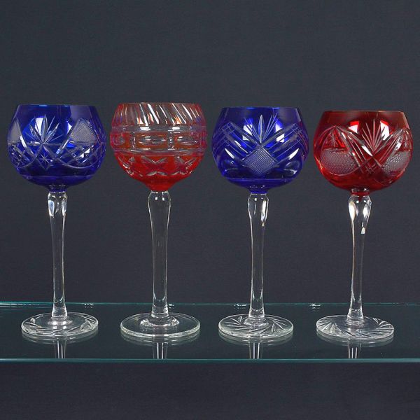 • <b>Conjunto de taças </b>em cristal colorido "overlay", com 9 peças na cor azul cobalto e 7 na cor rubi, todas com bojo ricamente lapidado e haste lisa. Alt. 25 cm
