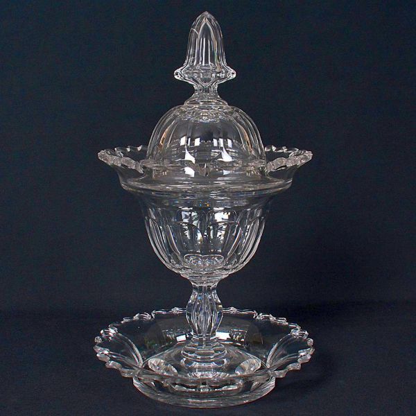 • <b>Compoteira e respectivo "presentoir" </b>em cristal Baccarat lapidado. Apresenta formato de tulipa, com bojo polifacetado. Base robusta. Alt. 35 cm