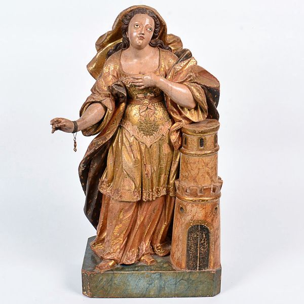 • Belíssima imagem de <b>Santa Bárbara </B>em madeira entalhada com feições voltadas ao céu e vestes graciosamente sobrepostas. Policromia e douração de época. Olhos em contas e base marmorizada. Séc. XVIII. Alt. 62 cm