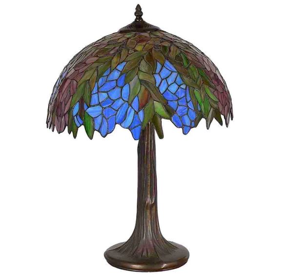 • "<b>Abatjour</b>" em estilo Tiffany, com estrutura em metal patinado com base modelada imitando tronco de árvore. Cúpula composta por delicados vitrais em tons de azul, verde e "bordeaux". Alt. 55 cm