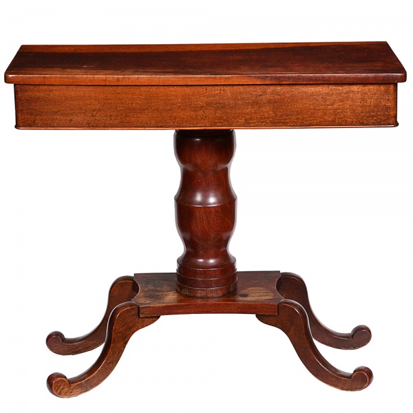 • <b>Console </b>em madeira nobre, com tampo retangular, montante central torneado em formato de balaústre terminando em quatro pés recurvados em volutas. Brasil, séc. XIX / XX. Med. 83 x 94 x 40 cm