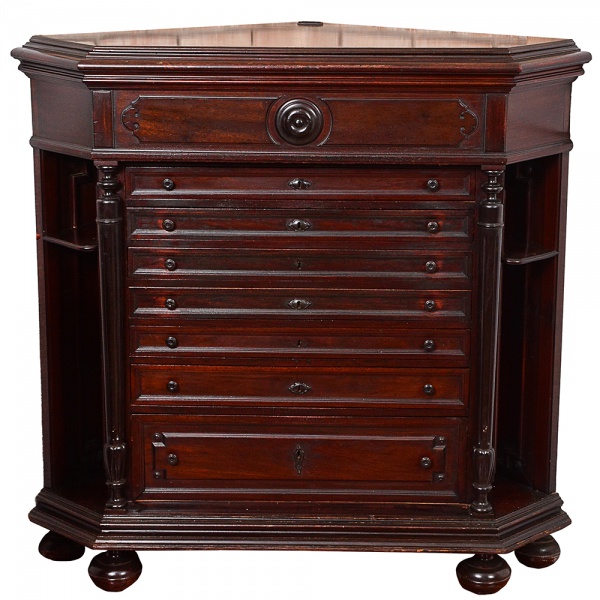 • <b>Móvel de canto </b>em madeira nobre, de formato trapezoidal, com tampo chanfrado e base moldurada, apoiada sobre pés tipo bolacha. Frente composta por oito gavetas centrais ladeadas por colunas torneadas e prateleiras laterais embutidas. Bandeja superior com ornamento circular entalhado e ferragens originais em metal patinado. Brasil, final do séc. XIX / início do XX. Med. 123 x 115 x 86 cm
