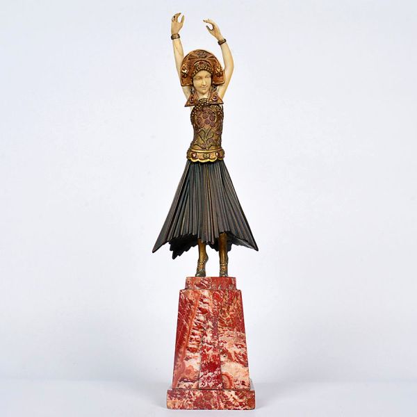 • <b>Demetre Chiparus</b><Br>(18861947)<Br>Escultura Art Déco criselefantina, em marfim e bronze patinado. Representando bailarina em movimento, com braços erguidos. Traja vestido plissado e adereços orientais, ricamente detalhados. Base em mármore vermelho veteado. França, circa 1925. Alt. 38 cm