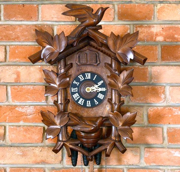• <b>Relógio de parede </b>em madeira entalhada, representando casa alpina adornada por folhas e pássaros, com mostrador circular em fundo negro, algarismos romanos aplicados e ponteiros trabalhados em metal dourado. Mecanismo de corda acionado por pesos em formato de pinha. Alt. 45 cm