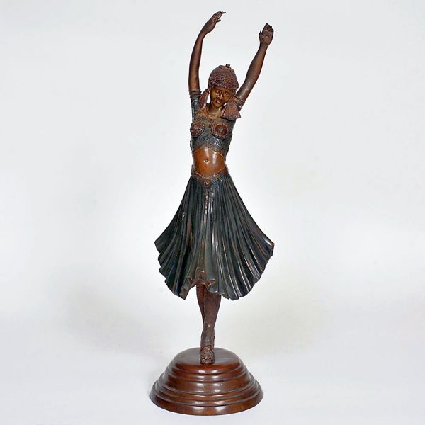 • Réplica de escultura Art Déco, em bronze patinado, representando bailarina em movimento, com braços erguidos e vestimenta típica com detalhes minuciosamente trabalhados. Base circular escalonada. Alt. 66 cm