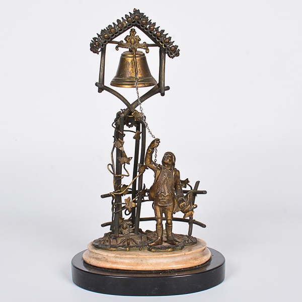 • <b>Escultura </b>decorativa em bronze representando jovem camponês acionando sino suspenso. Estrutura com treliças e folhagens, sobre base circular em mármore e madeira. Séc. XIX / início do XX. Alt. 26 cm