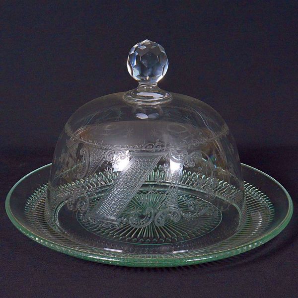 • <b>Queijeira </b>em cristal lapidado. Prato de borda trabalhada sustentando cúpula transparente adornada por delicados arabescos gravados. Puxador facetado ao topo. Alt. 19 cm ; Diâm. do prato 28 cm