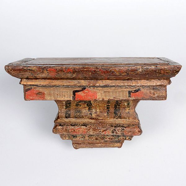 • <b>Peanha </b>em madeira, com vestígios de policromia antiga em tons de ocre, vermelho e verde, apresentando recortes em degraus e reforço metálico posterior para fixação em parede. Med. 15 x 25 cm