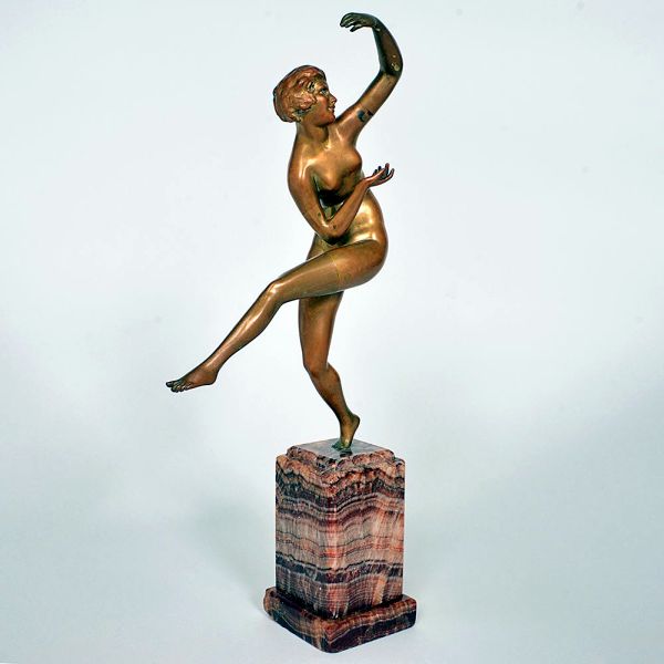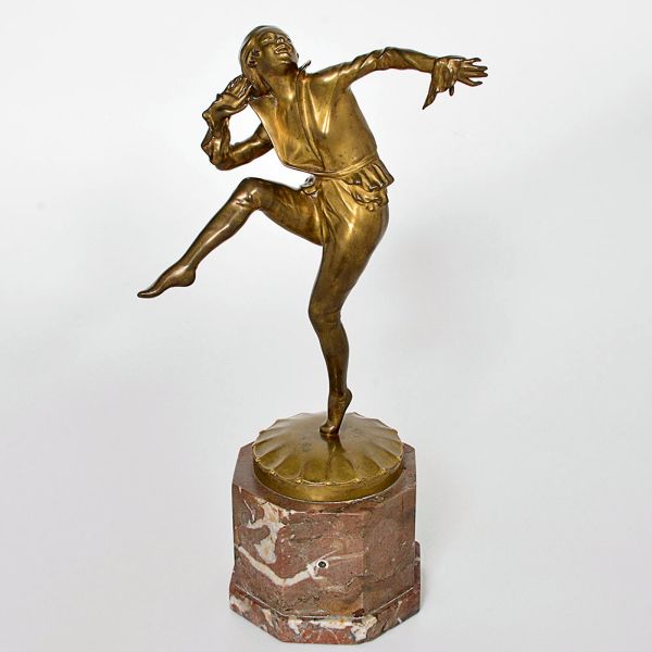 • <b>J. LORENZL - Escultura </b>em bronze, representando figura em pose dinâmica de dança, com expressão alegre e vestes estilizadas. Apoiada sobre base octogonal em mármore rajado. Alt. 30 cm
