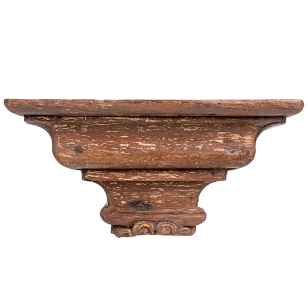 • <b>Peanha </b>em madeira, com vestígios de policromia antiga e recorte em volutas. Estrutura reforçada na parte posterior para fixação em parede. Med. 16 x 32 cm