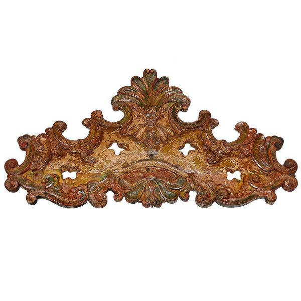 • Belo <b>florão </b>ricamente entalhado e policromado com elementos do Barroco e pequenos vazados. Séc. XVIII. Alt. 90 cm; Compr. 170 cm