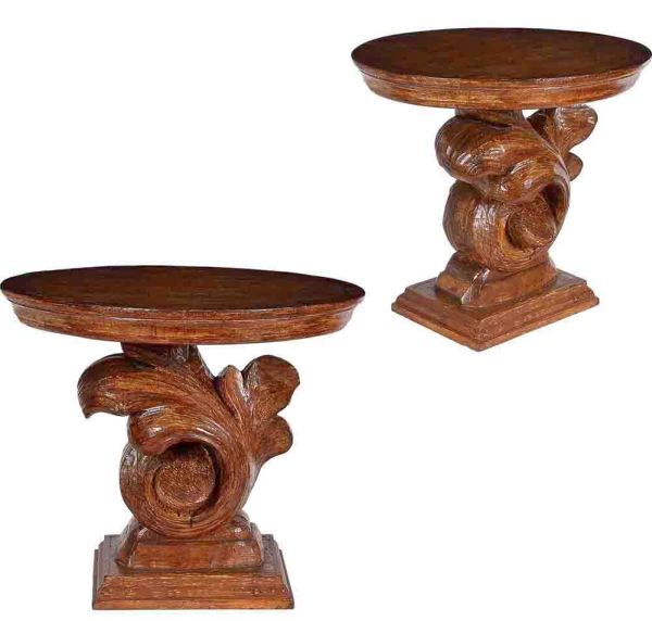 • <b>Par de mesas laterais </b>em madeira entalhada, com base em volutas de inspiração clássica e tampo circular. Med. 62 x 70 cm