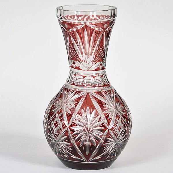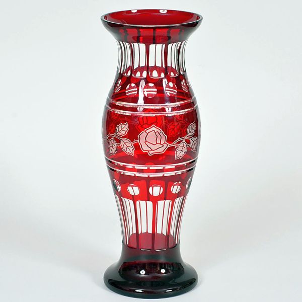 • <b>Vaso </b>em cristal "overlay" na cor rubi, lapidado com delicados desenhos geométricos e florais. Alt. 36 cm
