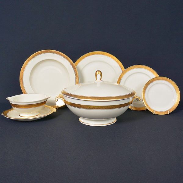• <b>Serviço de jantar </b>em porcelana alemã Rosenthal, apresentando borda decorada a ouro com filetes sobre fundo branco. Marca da manufatura no verso. Constando de 22 pratos rasos, 11 pratos de sopa, 12 pratos de sobremesa, 12 pratos de pão, 1 sopeira, 1 molheira c/ base fixa e 1 travessa oval (38 cm). Total de 60 peças.