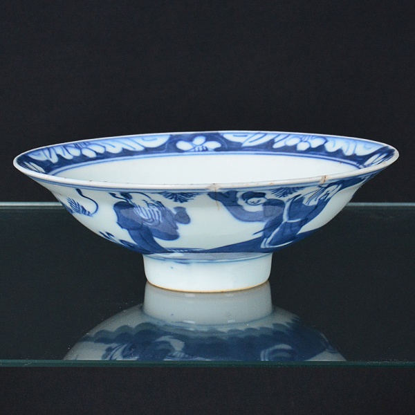 • <b>Covilhete </b>circular sobre base elevada, em porcelana azul e branco, decorado internamente com reserva central com paisagem estilizada e borda com motivos florais contínuos. Parte externa com representação de figuras em paisagem. Apresenta bicados e trinca visível na aba. Diâm. 14 cm