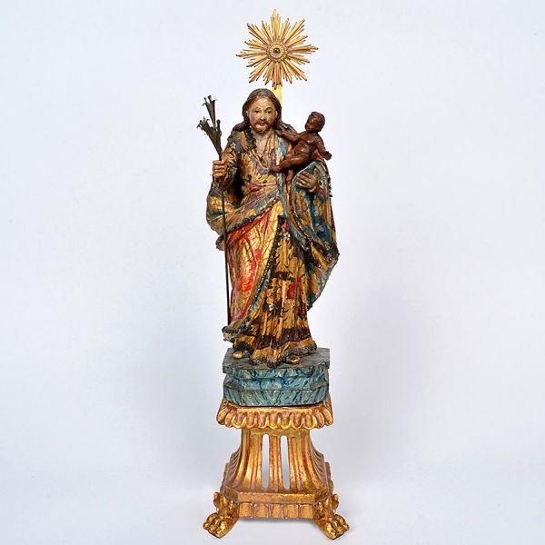 • Imagem brasileira em madeira esculpida, policromada e dourada, representando <b>São José</b>. Apresenta-se em sua tradicional postura, tendo o Menino Deus ao braço esquerdo, de pé com a perna direita semiflexionada e levemente recuada. Séc. XIX. Acompanha resplendor. Alt. 30 cm