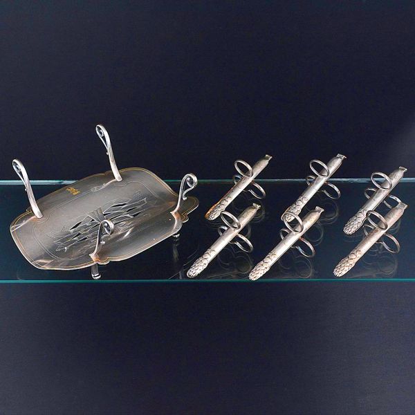 • <b>Bandeja para aspargos </b>em metal Christofle, acompanhada de seis pegadores, com monograma. Peça de linhas elegantes e acabamento polido, característica da manufatura francesa. Os pegadores seguem o mesmo desenho refinado. Compr. da bandeja 21 cm