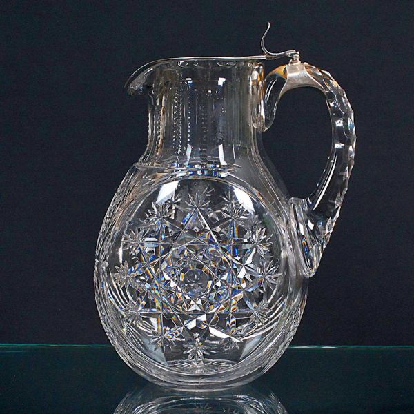 • <b>Jarra </b>em cristal com tampa articulada em metal. Corpo bojudo ricamente lapidado em padrões geométricos e florais em alto-relevo, com alça facetada e bico com acabamento superior em metal. Monograma gravado e datado "25-4-1921".
