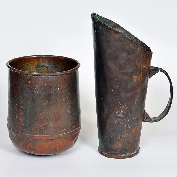 • <b>Conjunto composto por dois vasos </b>em bronze de formatos distintos, ambos de corpo martelado e pátina natural do tempo. Um em forma cilíndrica simples e o outro com bico vertedor e alça lateral. Alt. do maior. 42 cm