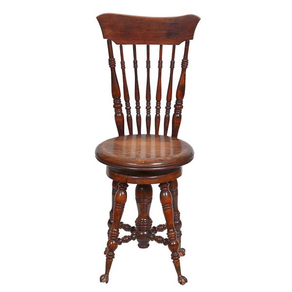 • <b>Cadeira </b>em madeira, apresentando encosto com haste curva superior e palitos verticais ornamentados. Assento redondo e base apoiada sobre quatro pés torneados, ligados por travessas centrais. Alt. 94 cm