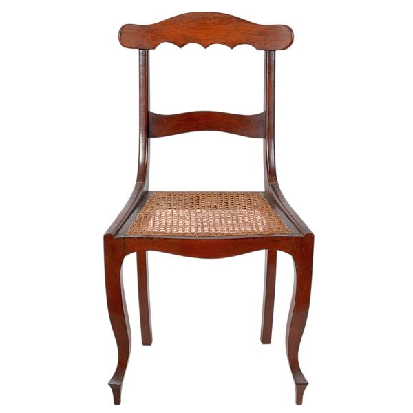 • <b>Cadeira </b>em madeira com espaldar formado por travessas arqueadas e assento em palhinha, apoiada sobre pernas dianteiras curvilíneas tipo "cabriolet" e traseiras retas. Alt. 86 cm