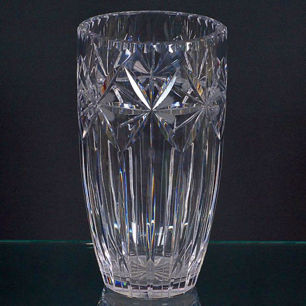 • <b>Vaso </b>em cristal, de corpo cilíndrico, com lapidações em forma de estrelas na parte superior e cortes verticais alongados na base. Alt. 26 cm