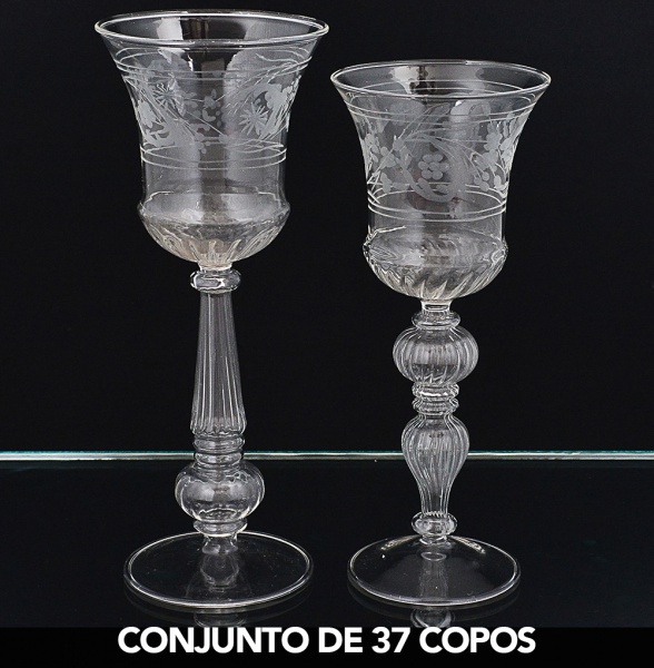 • <b>Conjunto de 37 copos </b>em cristal lapidado com gomos e decorados com frisos e flores gravados, sendo 20 maiores e 17 menores. Alt. 23 e 21 cm