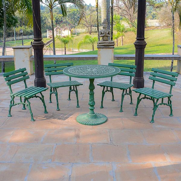 • <b>Conjunto de jardim composto por mesa redonda e quatro cadeiras </b>em ferro fundido pintado em verde, a mesa com tampo vazado de motivo rendilhado apoiado sobre base central torneada. Cadeiras com assento e encosto em réguas sustentadas por pés curvos trabalhados. Med. da mea 72 x 78 cm ; Alt. das cadeiras 65 cm