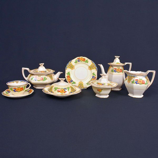 • <b>Serviço de chá </b>em porcelana inglesa John Maddock & Sons Ltd.  Royal Ivory  modelo "Minerva", com decoração floral policromada com detalhes em dourado. Constando de bulé para café, bule para chá, 12 pratos de pão, 10 xicaras p/ chá com pires, mantegueira e açucareiro. Total de 26 peças.