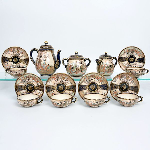 • <b>Serviço para chá </b>em porcelana japonesa, decorado em policromia com reservas, com figuras orientais em um jardim sobre fundo azul escuro e detalhes em dourado. Constando de bule p/ chá, leiteira, açucareiro e 6 xícaras c/ pires. Total de 9 peças. Marcas no verso. Alt. do bule 16 cm