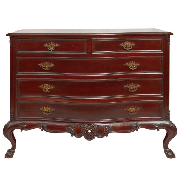 • <b>Cômoda </b>em madeira nobre, de frente sinuosa com três gavetas amplas e duas menores superiores. Ferragens em metal trabalhado. Base com entalhes em volutas e concha central, apoiada sobre pés "cabriolet" com garras. Med. 103 x 130 x 58 cm